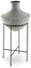 Take an effortlessly inviting approach to floor decor. This vase's distressed, textured look in a neutral hue pairs with a variety of casual color palettes. An espresso brown stand adds charming contrast to the look. And this vase enthusiastically welcomes faux florals and filler, perfectly adapting to the seasons when you swap out your arrangements.