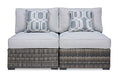 This cool, casual outdoor chair will raise the comfort level and visual appeal of your outdoor living space. Made of handwoven wicker in neutral tones of light and dark gray, the armless chair blends beautifully into your lanai or pool and patio area with thick, comfy cushions wrapped in Nuvella® high performance fabric that is stain resistant, fade resistant and easy to clean. This cushioned armless chair can be used on its own or paired with other pieces of the matching sectional to create a space that holds up to Mother Nature and ages gracefully for years of enjoyment.