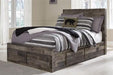 Modern yet hefty. This full panel bed with storage makes an urban eclectic statement. Seasoned raw wood look merges with the clean lined design we love today. Muted rustic finish over replicated pine grain maintains its authenticity for a beauteous look. Storage in the footboard and underneath the bed provides ample space for placing belongings out of sight. Mattress available, sold separately.